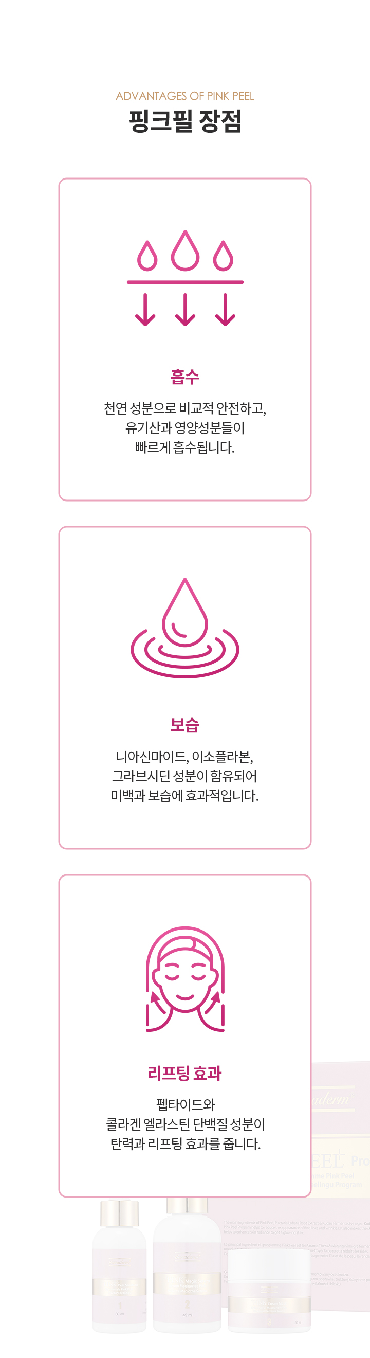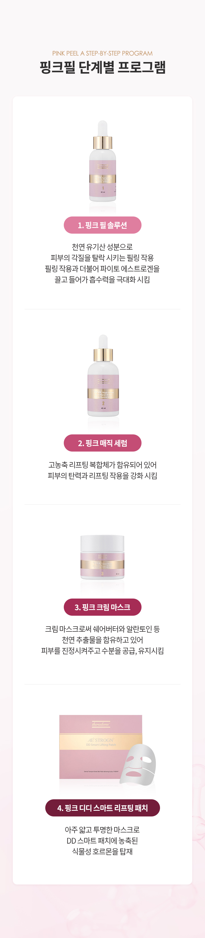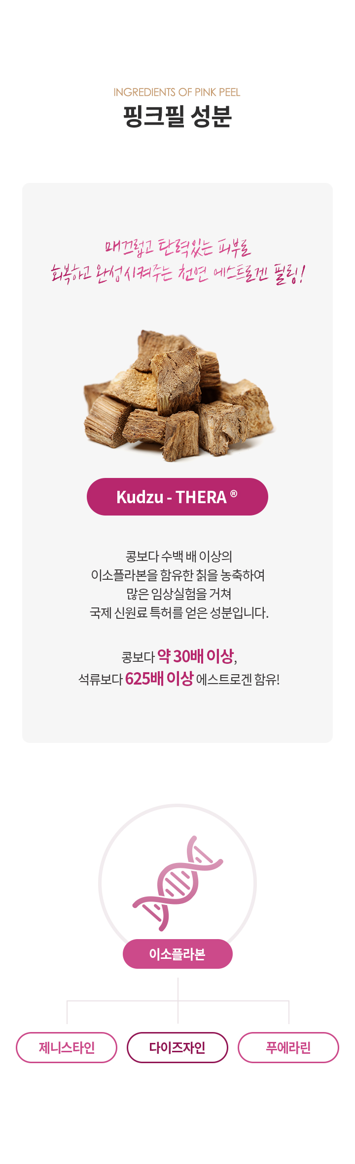 리프팅필이라고도 불리는 핑크필은 콩보다 30배의 이소플라를 함유한 Kudzu-THEA 갈근엑기스(칡의 뿌리)를