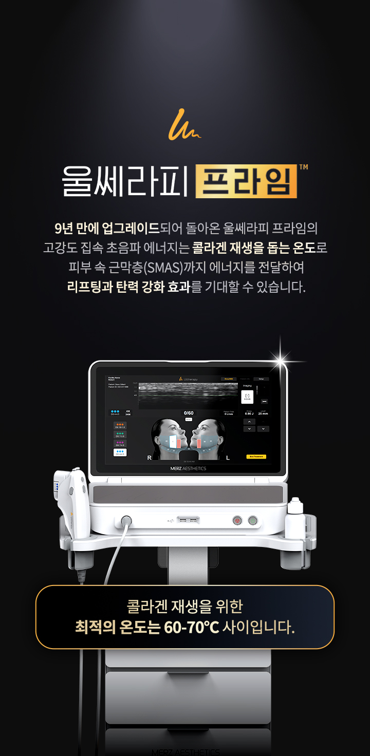 울쎄라는 초음파를 이용한 프리미엄 리프팅 장비로, 피부 표면의 손상 없이 근막(SMAS) 층에 에너지를 집속시켜