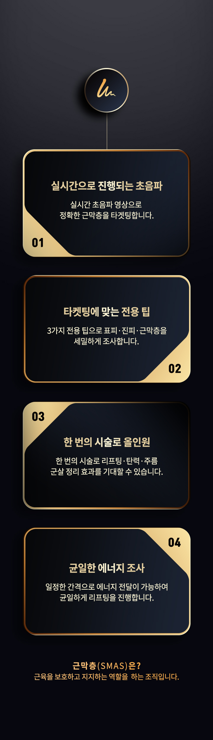 주로 턱 라인/볼/광대 라인 등의 쳐짐 개선이나, 전체적인 탄력 개선을 원할 때 진행할 수 있는 시술입니다.