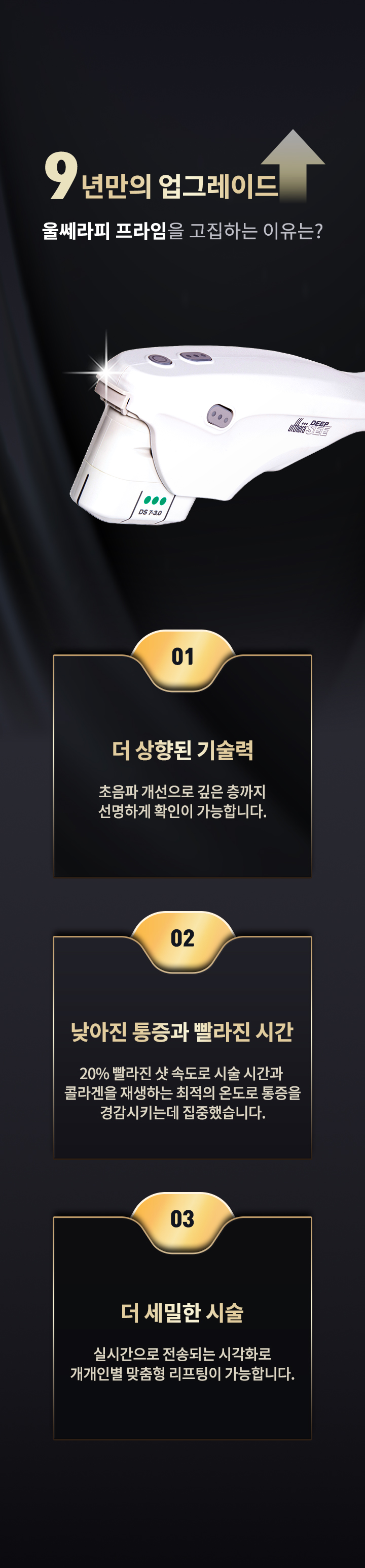 기존 울쎄라는 초음파 에너지를 최대 4.5mm 깊이까지만 전달할 수 있었으나, 울쎄라프라임은 초음파의 깊이를 최대 8mm까지 관찰하고 에너지를 전달할 수 있습니다. 또한 초음파 해상도를 개선하여 시술자가 보다 정밀하게 피부를 분석하고, 정확한 에너지 전달을 할 수 있게 되었습니다.