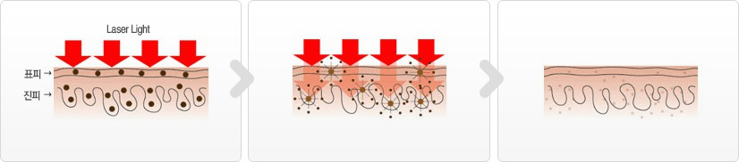 낮은 에너지로 여러번 반복하여 진피의 색소를 잘게 분해, |