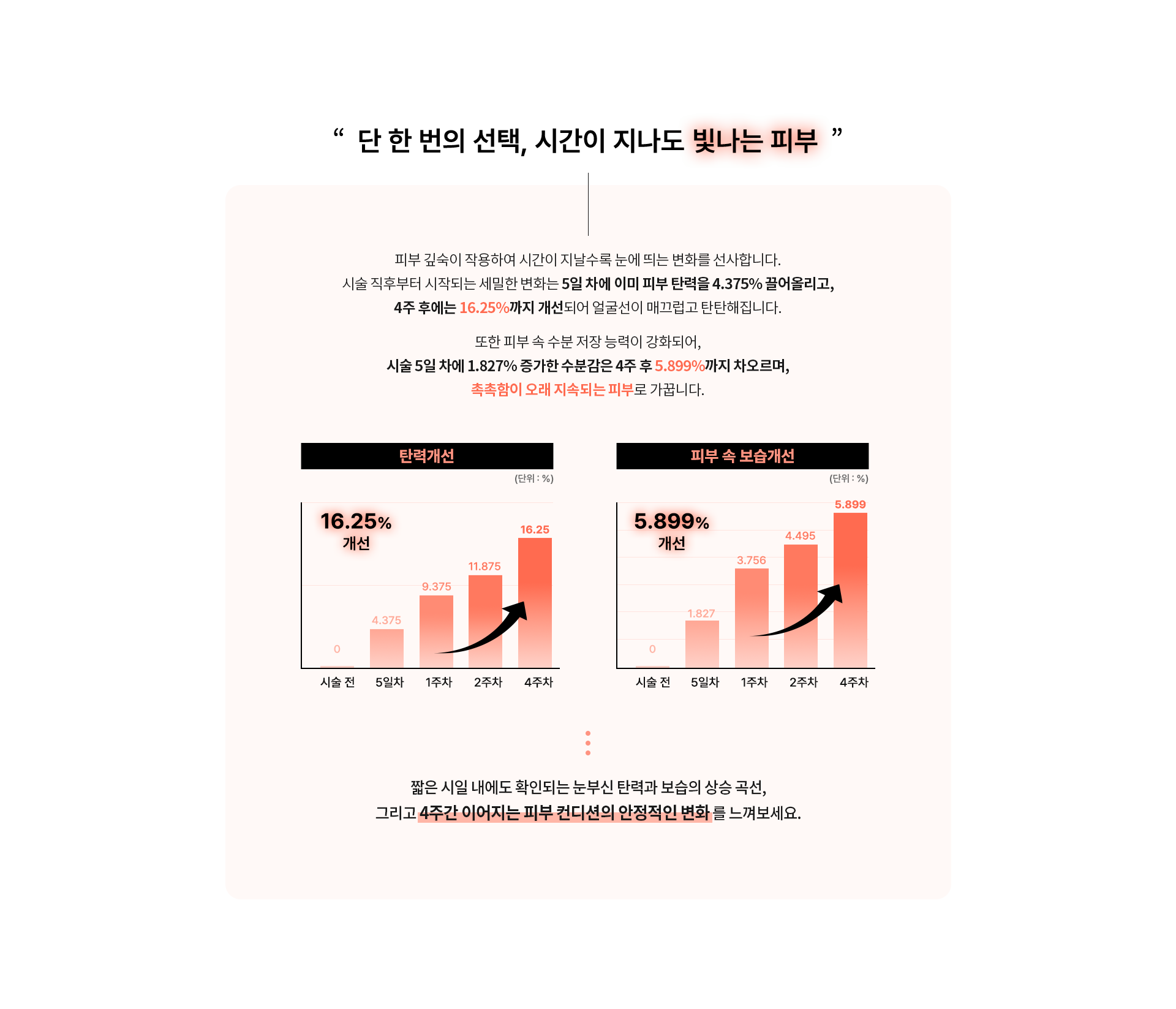 1 1회 시술만으로도 효과가 나타나지만, 4주 주기로 총 2회 이상 시술 시 더욱 좋은 효과를 느낄 수 있습니다.
